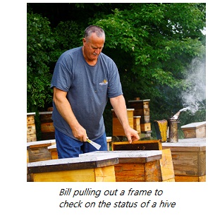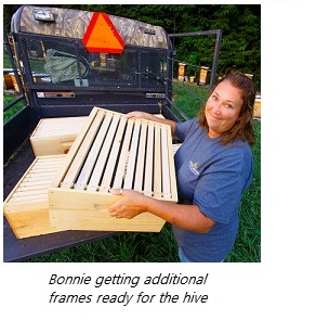 Our tour guides first explained to us that each new season starts in spring, when hives that were lost during the winter are replaced. Each hive “needs to be cleaned out and made ready to receive the new bee package, which arrives late March to early April,” Bonnie described. A “feeder bucket” of sugar water is placed on top of each hive to feed the new bees and “give them a boost since a lot of trees are not in bloom yet and they are very hungry.” For most of the summer the bees are left alone to produce honey, except for “periodic checks to ensure there is a good laying Queen to keep building up the work force and that there is no disease in the hive.”